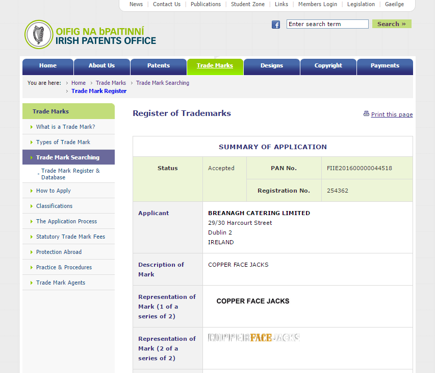 You might be surprised that they didn’t already have one, but actually it’s quite typical of Irish brands and businesses, and also very dangerous, particularly if you don’t have as unusual and distinctive a brand as “Copper Face Jacks” – If you’re an Irish business owner wondering whether you should register a Trade Mark, give me a call to discuss (Spoiler alert, the answer is almost certainly yes). Anyway, that’s the shameless plug bit out of the way, on to the amusing bit…
