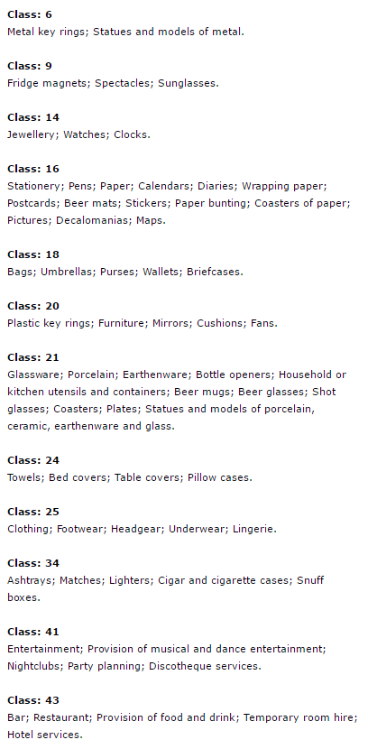 Here’s the list of stuff they want to be able to use their name/brand for.